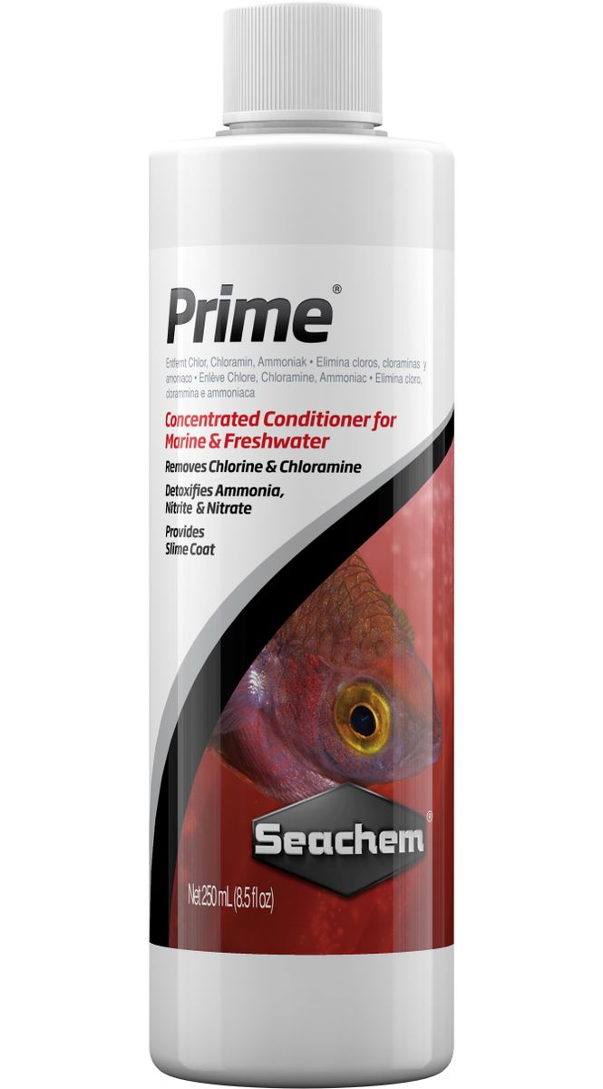 Seachem Prime הוא אחד מחומרי הטיפול במים הפופולריים והמרוכזים ביותר בעולם האקווריומים. הוא מנטרל באופן מיידי כלור וכלורמין, קושר אמוניה, ניטריט וניטראט לצורה פחות רעילה, ומנטרל גם מתכות כבדות – מבלי לשנות את ה-pH של המים.