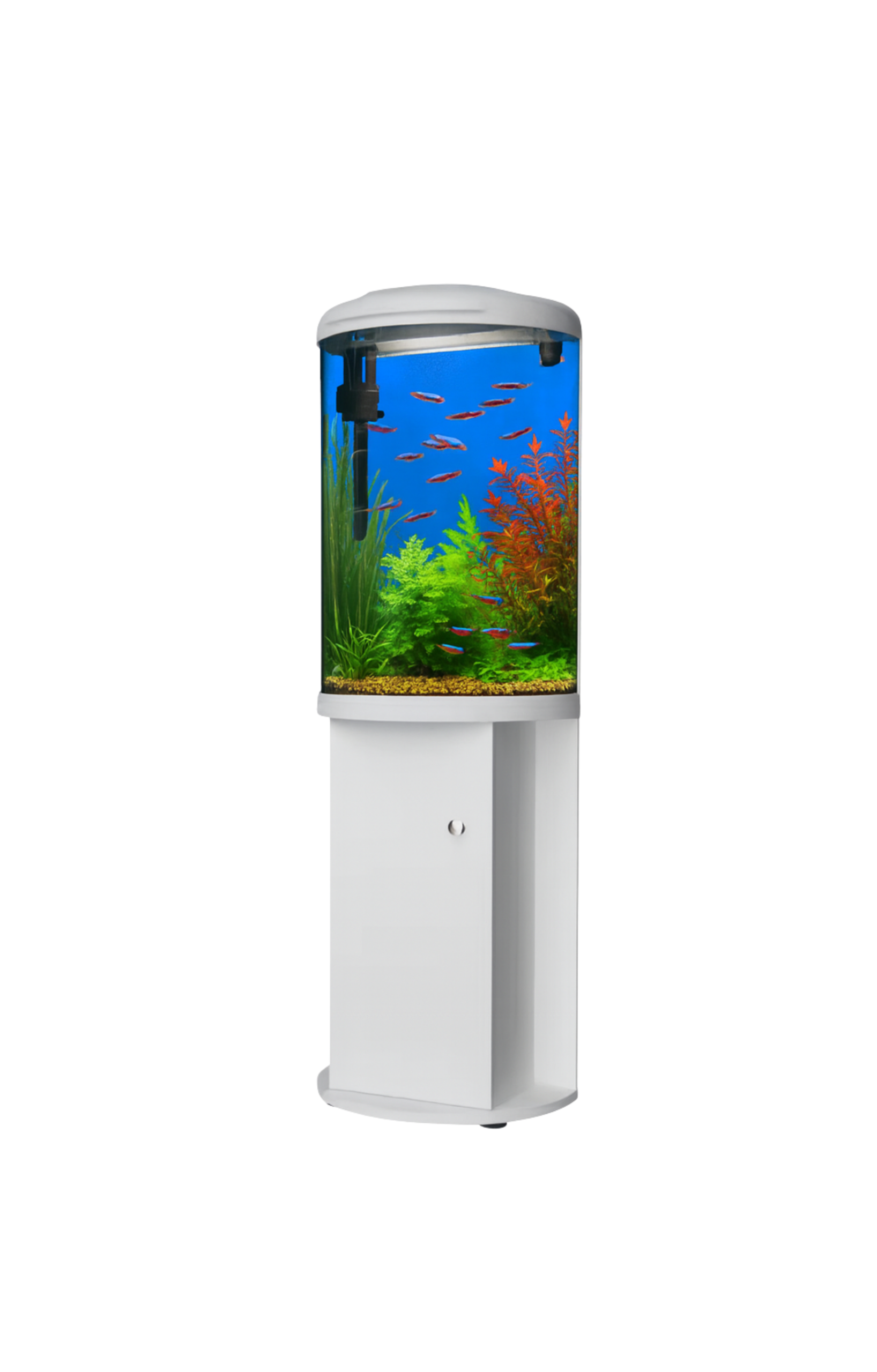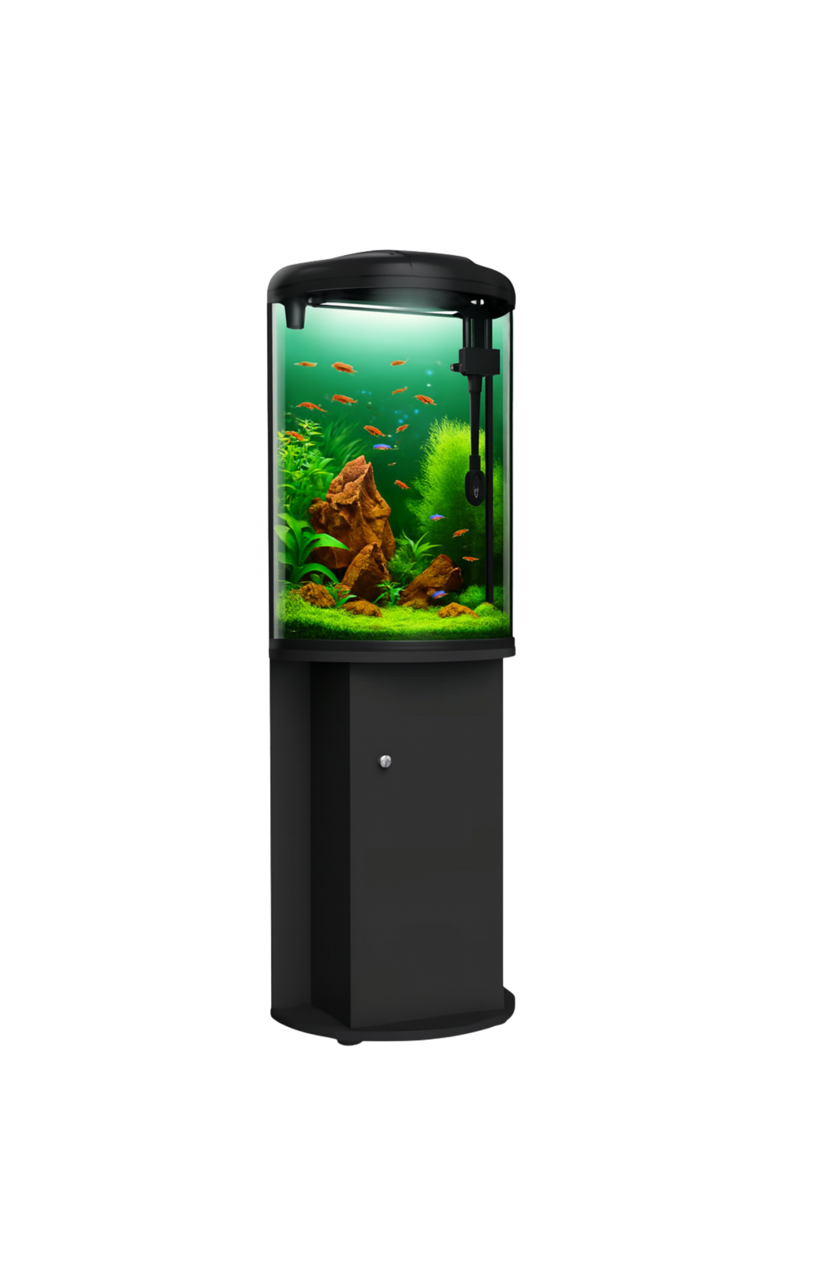 העיצוב החצי-עגול (חצי צילינדר) יוצר מראה יוקרתי ותחושת עומק מרשימה, מה שהופך אותו לא רק לאקווריום — אלא לפריט עיצוב מרכזי בבית.