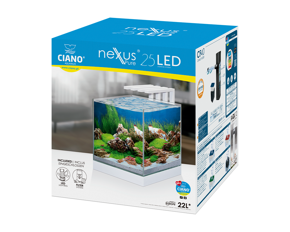 אקווריום CIANO Nexus Pure 25 מגיע כסט הכולל תאורת LED חסכונית באנרגיה ומערכת סינון פנימית מתקדמת, המאפשרות להקים אקווריום בצורה פשוטה ומהירה. האקווריום מצויד בתאורת LED CLA20 בעוצמה של כ-2.5W, המדמה אור יום טבעי ומדגישה את צבעי הדגים והצמחייה באקווריום, תוך צריכת חשמל נמוכה ובטיחות גבוהה הודות למערכת מתח נמוך.