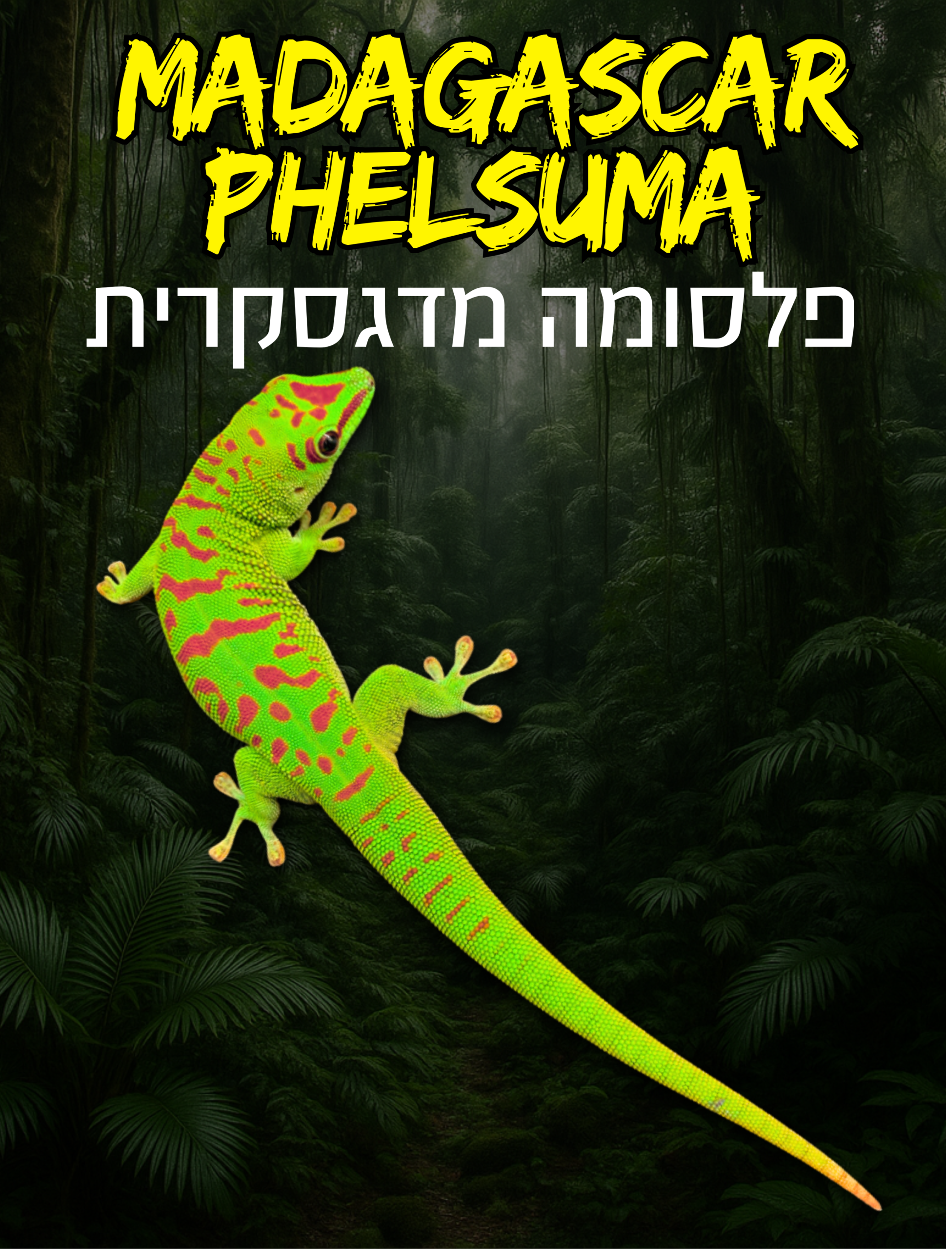בקיט שיוצא אליכם מגיעות צמד פלסומות צעירות ה-Phelsuma madagascariensis הוא סוג של לטאה ממשפחת הג'קווידיים, הידוע בזכות צבעו הירוק המבריק והפסים האדומים או הכתומים על ראשו. הוא נפוץ במאדגסקר ונחשב לחיית מחמד פופולרית בשל המראה המרשים והתנהגותו הידידותית. הלטאה פעילה ביום, זקוקה לסביבה חמה וללחות גבוהה, ומאכילה בעיקר בפירות וחרקים.