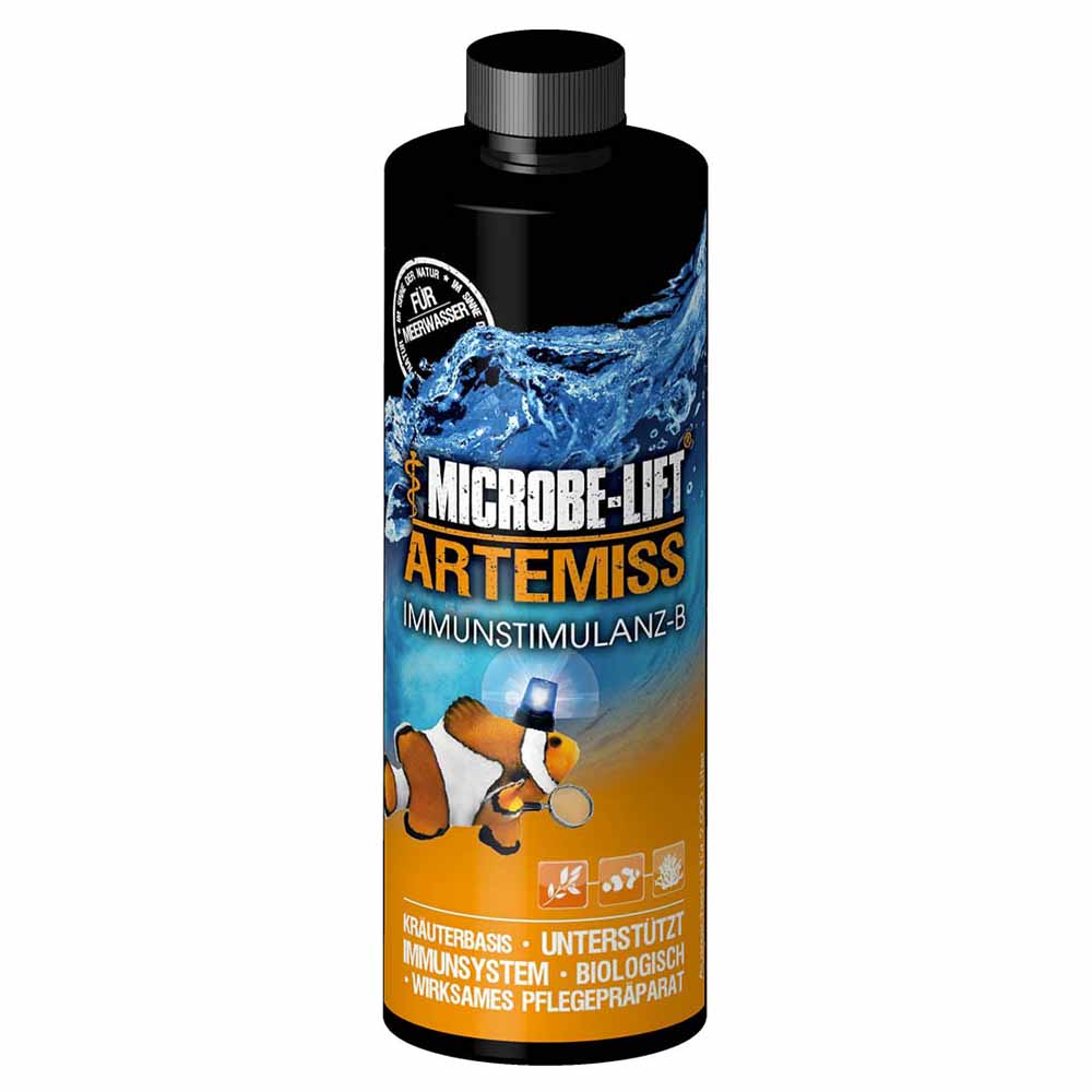 MICROBE-LIFT Artemiss 473ml הוא תכשיר טבעי המבוסס על תמציות צמחים, שנועד לסייע בטיפול במחלות חיידקיות ופטרייתיות בדגי נוי. המוצר מחזק את מערכת החיסון של הדג ומסייע לגוף הדג להתגבר על הזיהום באופן טבעי, ללא אנטיביוטיקה, נחושת או כימיקלים אגרסיביים. הוא מתאים למים מתוקים, מים מלוחים וריף, ואינו פוגע בפילטר הביולוגי, באלמוגים, בצמחי מים או בחסרי חוליות כאשר משתמשים בו לפי ההוראות.